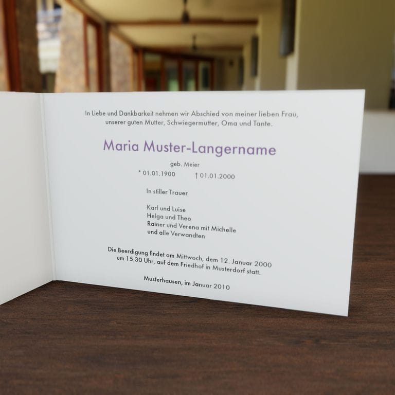 Diese Trauerkarte ist 4-seitig und wird individuell für Sie in Farbe gedruckt.