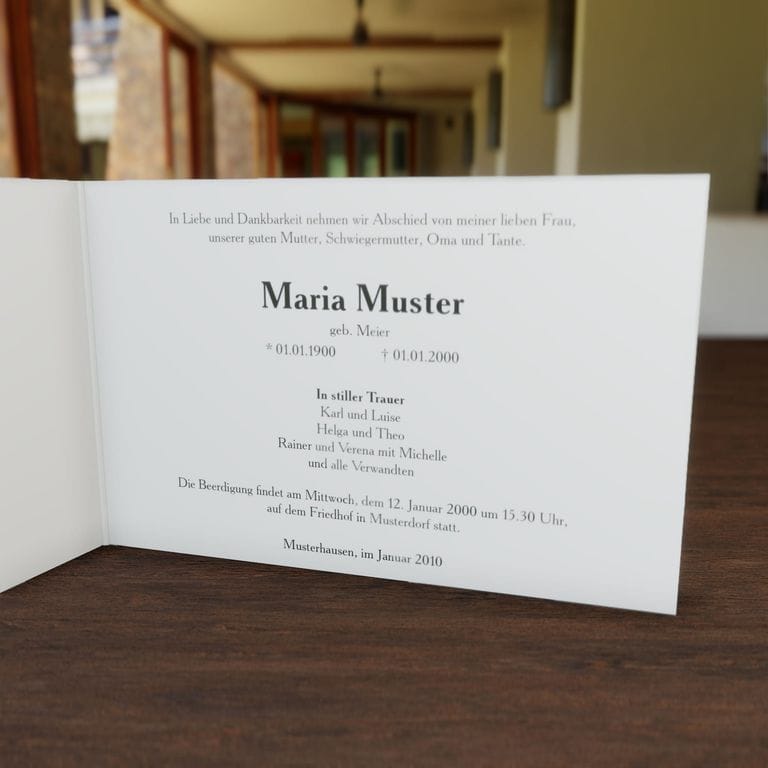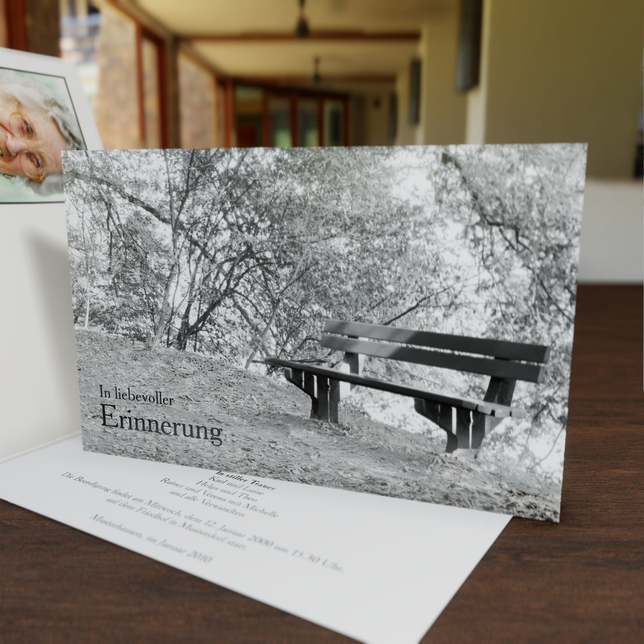 Informieren Sie nahestehende Verwandte und Freunde mit dieser dezenten Trauer Klappkarte „Bank“ über den eingetretenen Trauerfall und den Termin für die Trauerfeier.