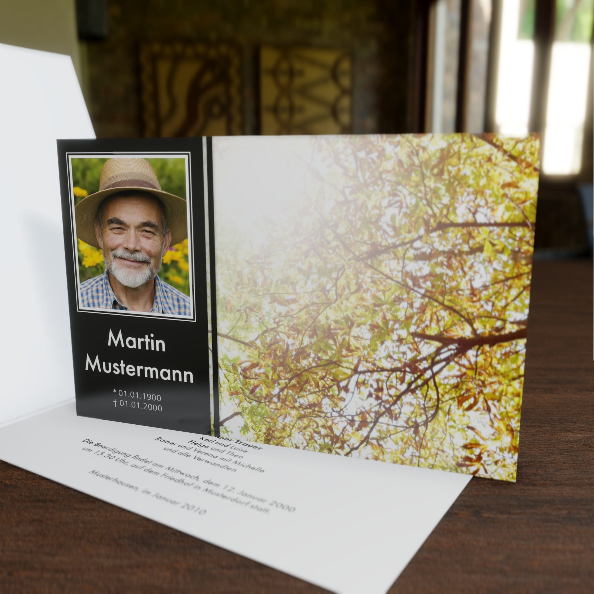 Stilvolle Trauerdanksagungskarte mit dem Motiv "Blätterdach."