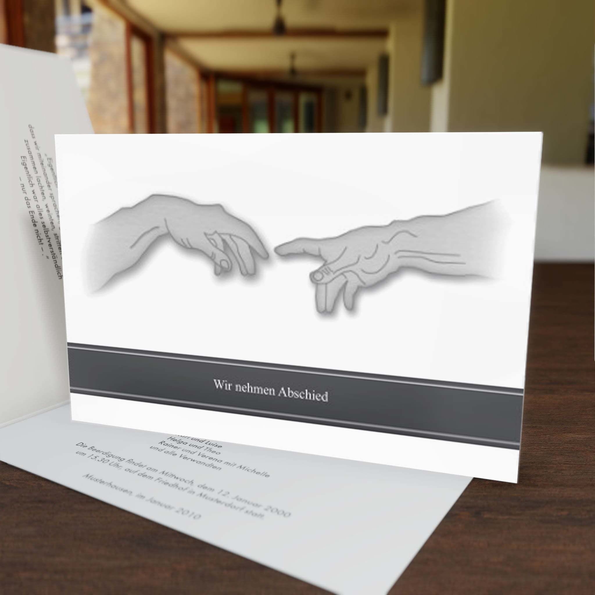 Informieren Sie nahestehende Verwandte und Freunde mit dieser dezenten Trauer Klappkarte „Erschaffung Adams“ über den eingetretenen Trauerfall und den Termin für die Trauerfeier.