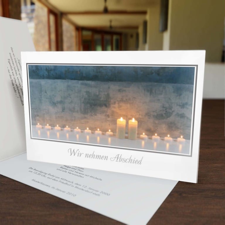 Informieren Sie nahestehende Verwandte und Freunde mit dieser dezenten Trauer Klappkarte „Kerzen“ über den eingetretenen Trauerfall und den Termin für die Trauerfeier.