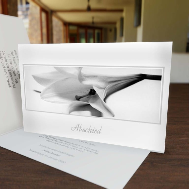 Informieren Sie nahestehende Verwandte und Freunde mit dieser dezenten Trauer Klappkarte „Lilie liegend 2“ über den eingetretenen Trauerfall und den Termin für die Trauerfeier.