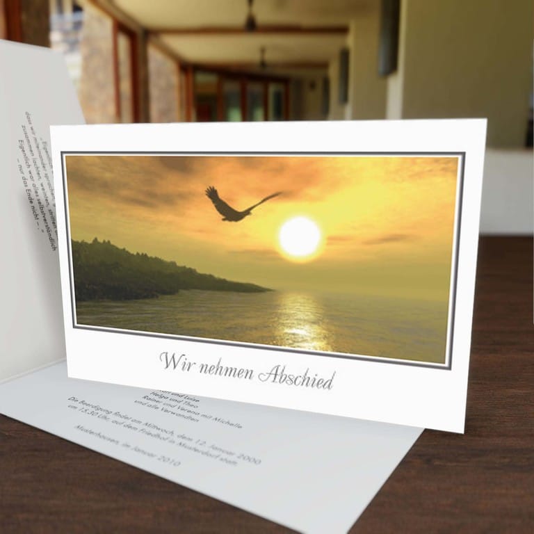 Informieren Sie nahestehende Verwandte und Freunde mit dieser dezenten Trauer Klappkarte „Möwe u. Sonne“ über den eingetretenen Trauerfall und den Termin für die Trauerfeier.