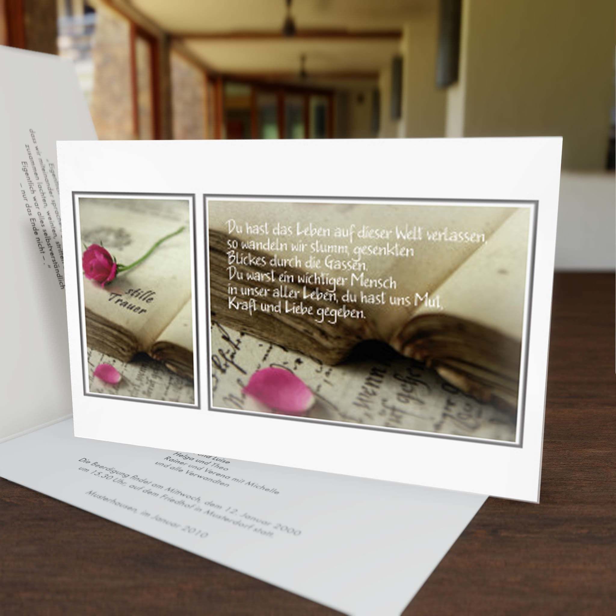 Informieren Sie nahestehende Verwandte und Freunde mit dieser dezenten Trauer Klappkarte „Rosenbuch“ über den eingetretenen Trauerfall und den Termin für die Trauerfeier.