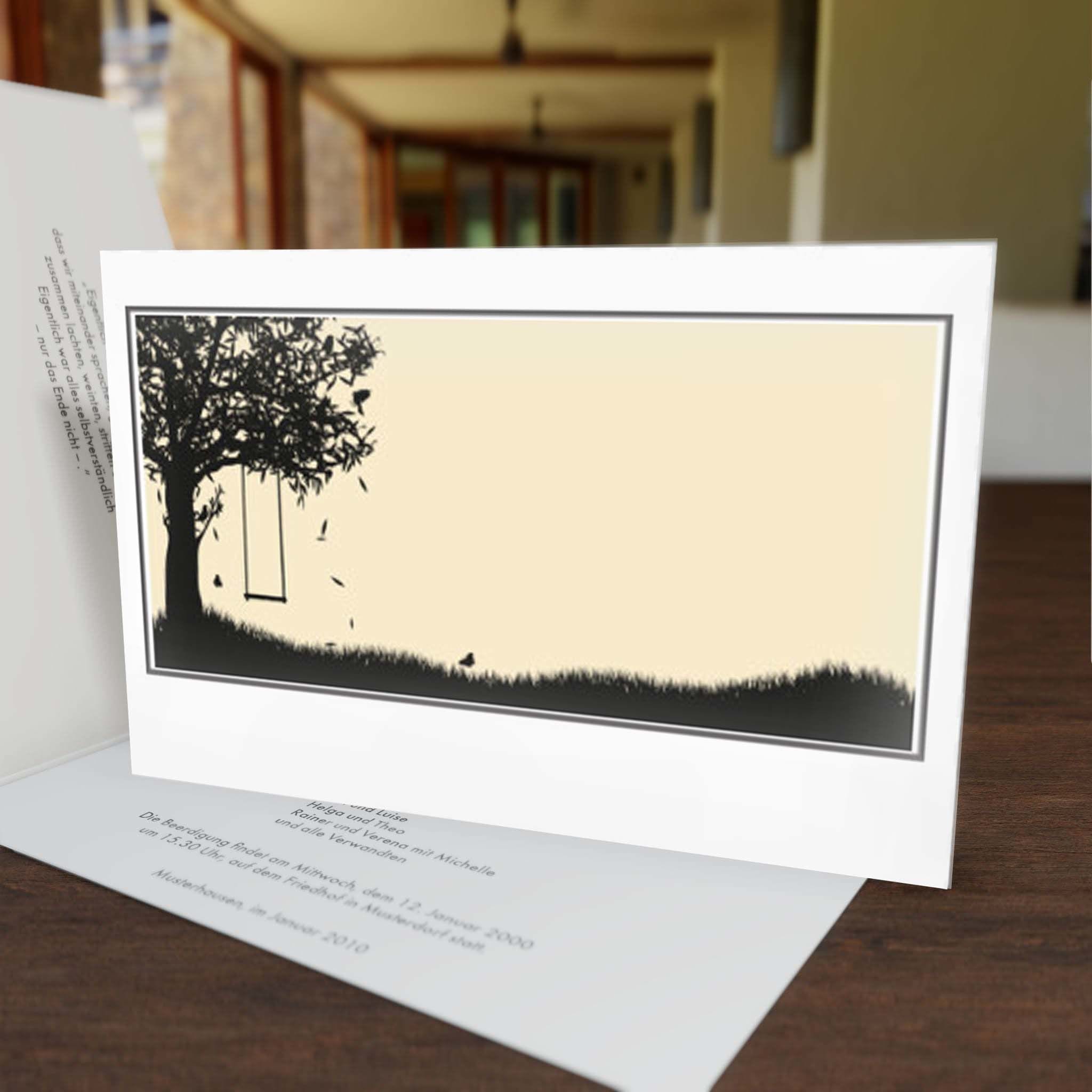 Informieren Sie nahestehende Verwandte und Freunde mit dieser dezenten Trauer Klappkarte „Schaukel“ über den eingetretenen Trauerfall und den Termin für die Trauerfeier.